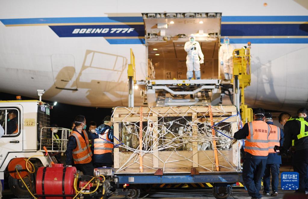 銀川海關及銀川河東國際機場工作人員對種羊進行檢疫、消殺、轉運(2月22日攝)。