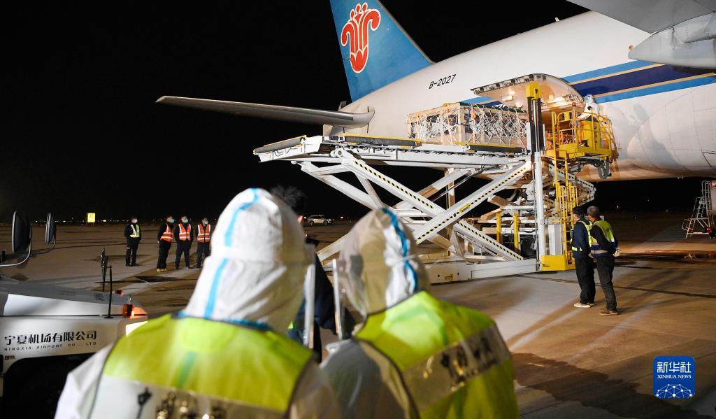 銀川海關(guān)及銀川河?xùn)|國際機(jī)場工作人員對種羊進(jìn)行檢疫、消殺、轉(zhuǎn)運(2月22日攝)。