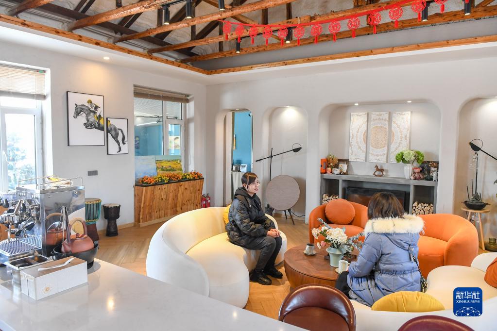 2月23日,游客在吉林市永吉縣北大湖鎮五里河村一家民宿咖啡廳休息。