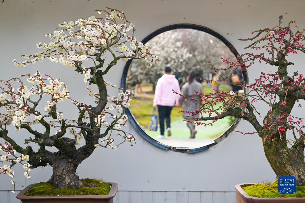 2月18日,游客在江蘇省第二十七屆蘇州太湖梅花節(jié)香雪海梅花盆景展上欣賞梅花。