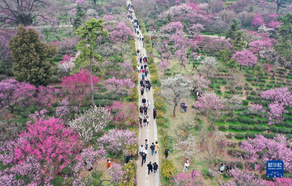2月18日,人們在南京梅花山踏青賞花(無人機照片)。
