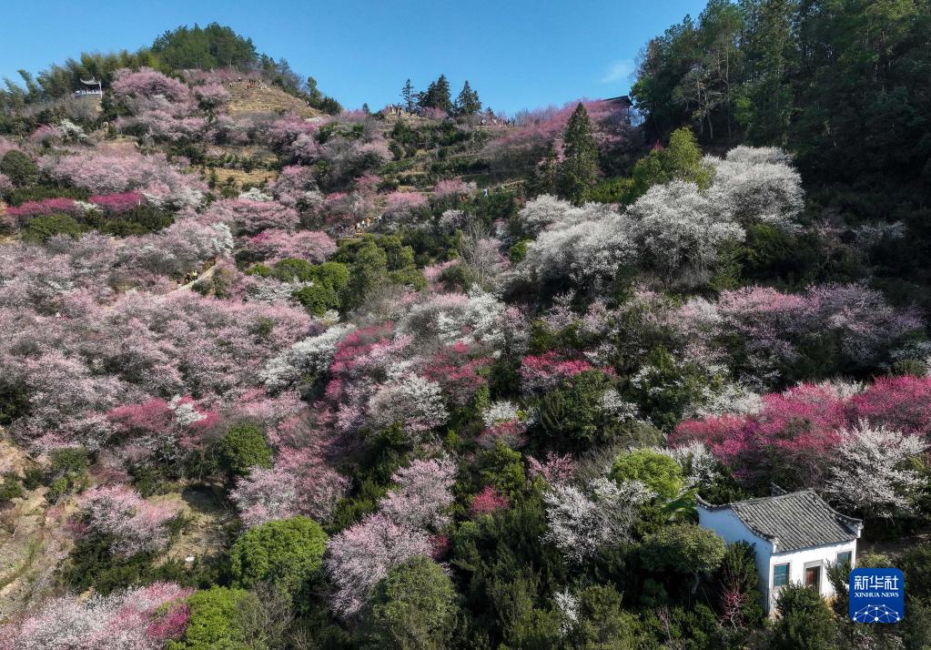 2月21日在安徽省黃山市歙縣賣花漁村拍攝的梅花(無人機拍攝)。