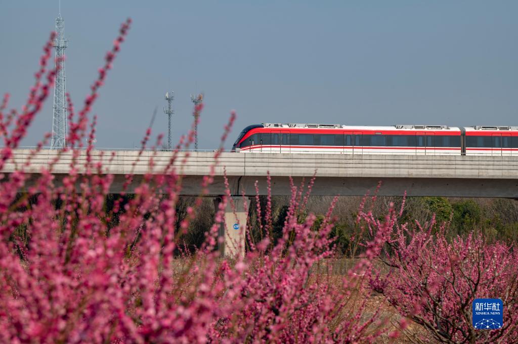 2月17日,一輛城市軌道列車從浙江省金華市塘雅鎮石板堰村梅園旁駛過。