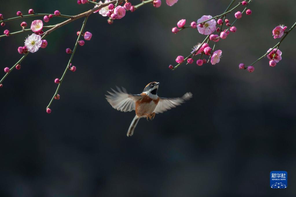2月18日,在江蘇省無錫市管社山莊,一只小鳥在梅花叢中飛舞。