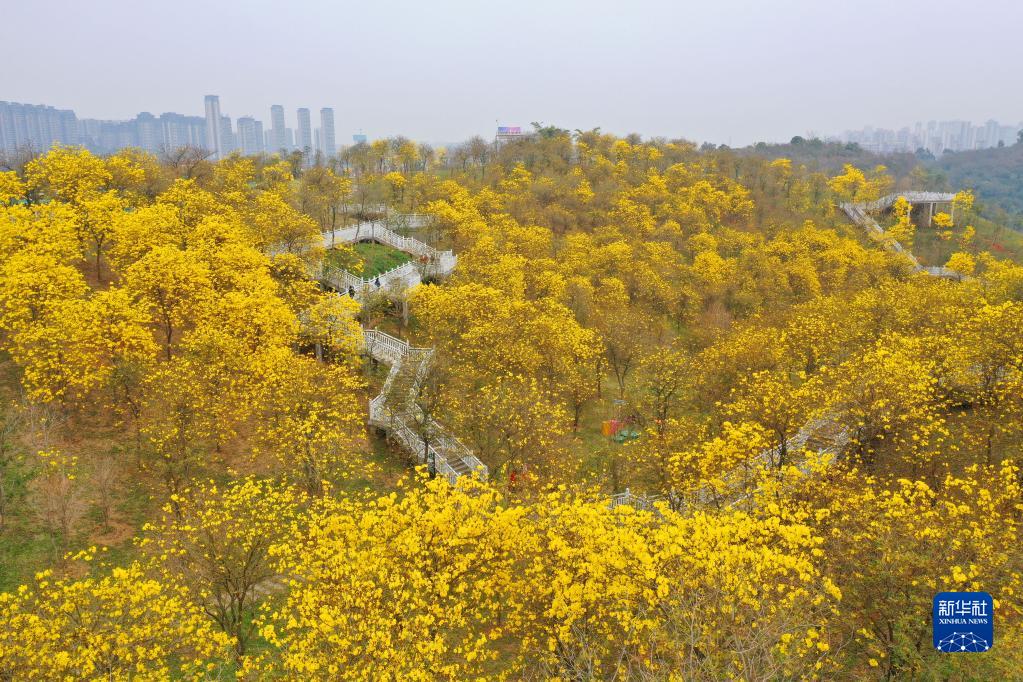 2月23日,游人在廣西南寧市青秀山風景區的風鈴谷觀賞綻放的黃花風鈴木花(無人機照片)。