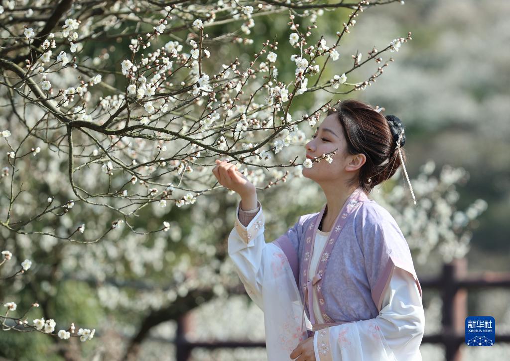 2月20日,游客在浙江省湖州市吳興西塞山旅游度假區的瀛洲梅園賞花游玩。