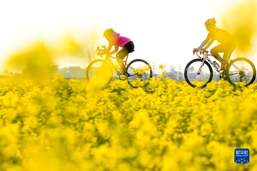 2月21日,騎行愛好者在江西省樟樹市永泰鎮官湖村油菜花海中騎行。