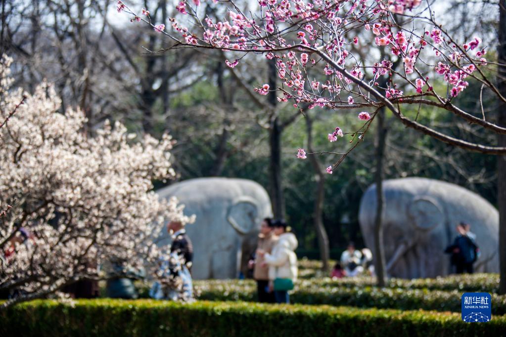 2月20日,游人在南京明孝陵景區神道旁賞花游玩。