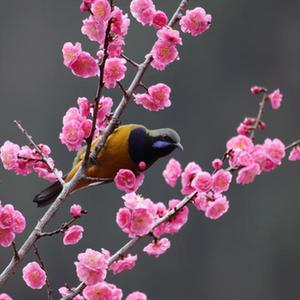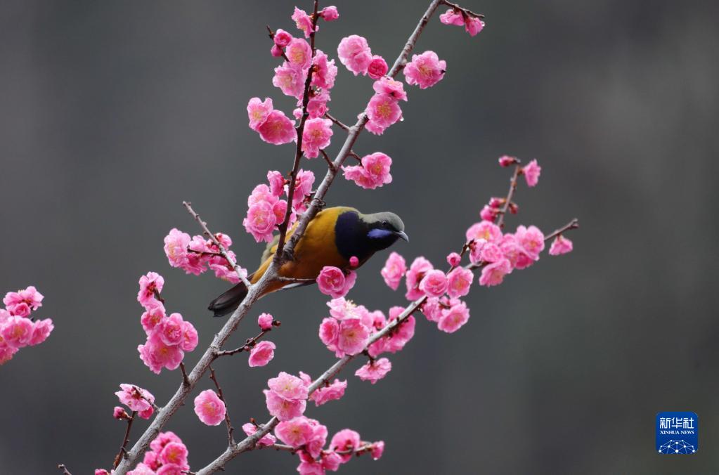 2月23日,在張家界市武陵源區黃龍洞景區,一只小鳥在花枝上停留。