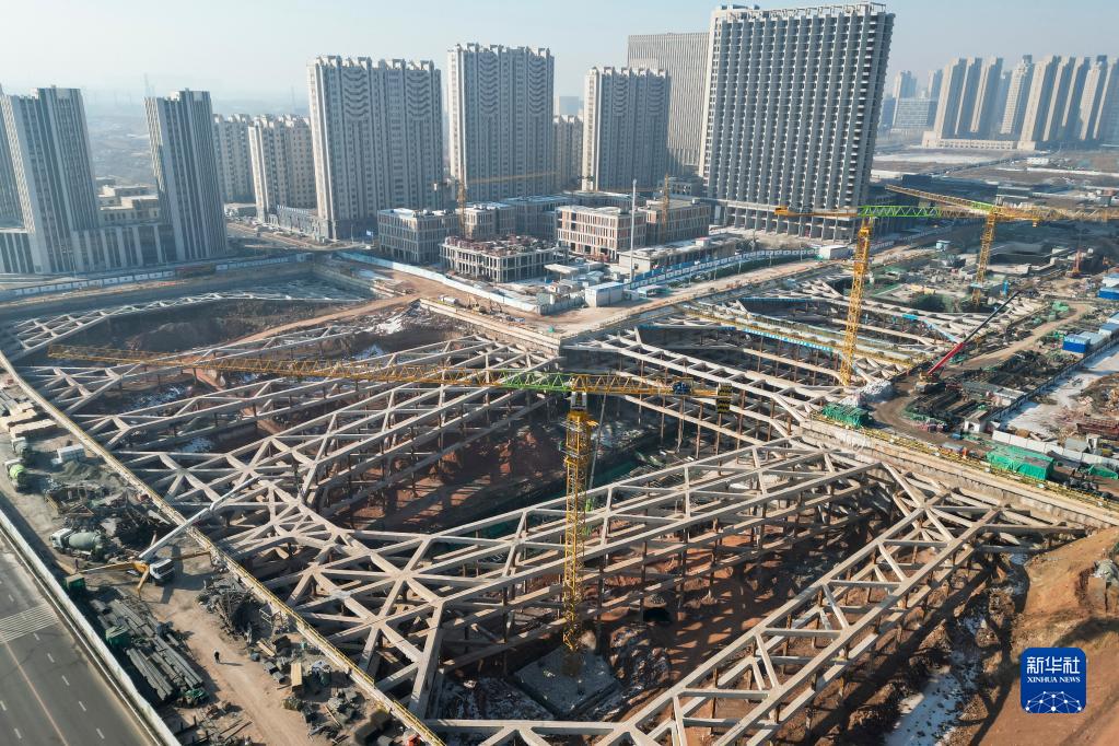 2月23日拍攝的長春市城市軌道交通6號線03標段三工區華慶路站施工現場(無人機照片)。