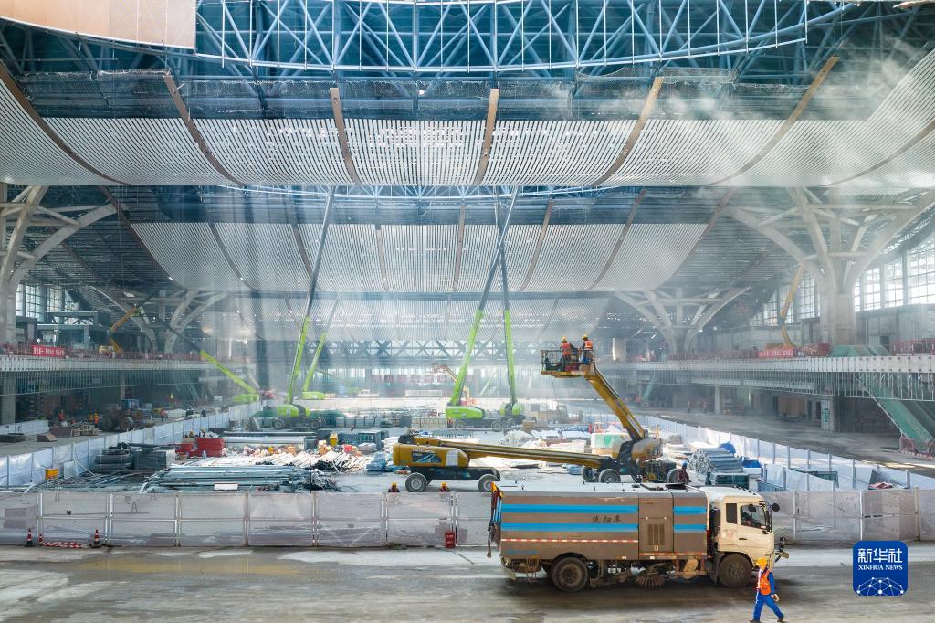2月23日,中鐵建設集團有限公司施工人員在新建福廈鐵路廈門北站候車大廳進行吊頂安裝(無人機照片)。