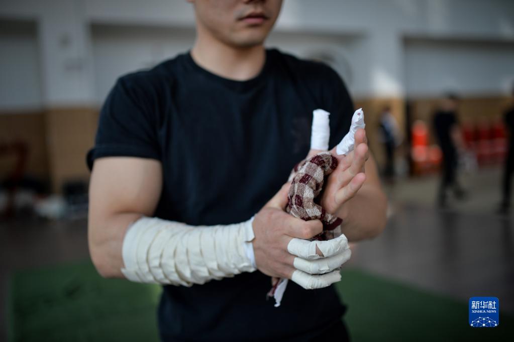 3月31日,在位于江蘇省鹽城市建湖縣的江蘇省雜技團,一名演員的雙手纏滿膠布。