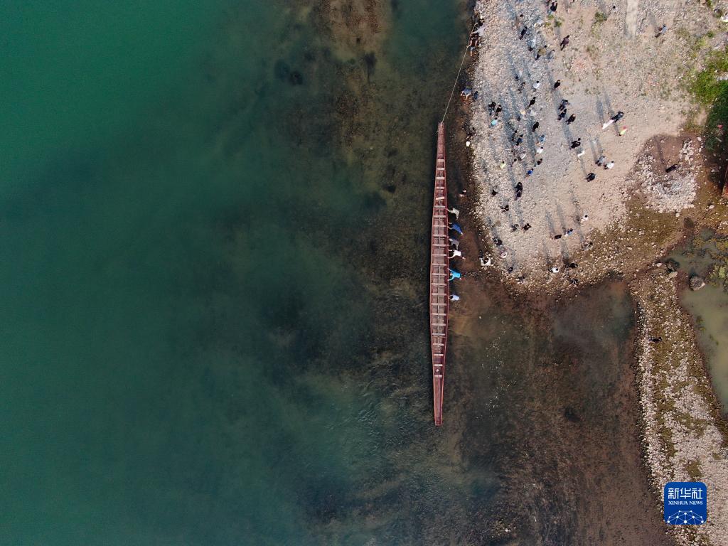 4月1日,景洪市勐罕鎮曼聽村村民推送龍舟進入瀾滄江(無人機照片)。
