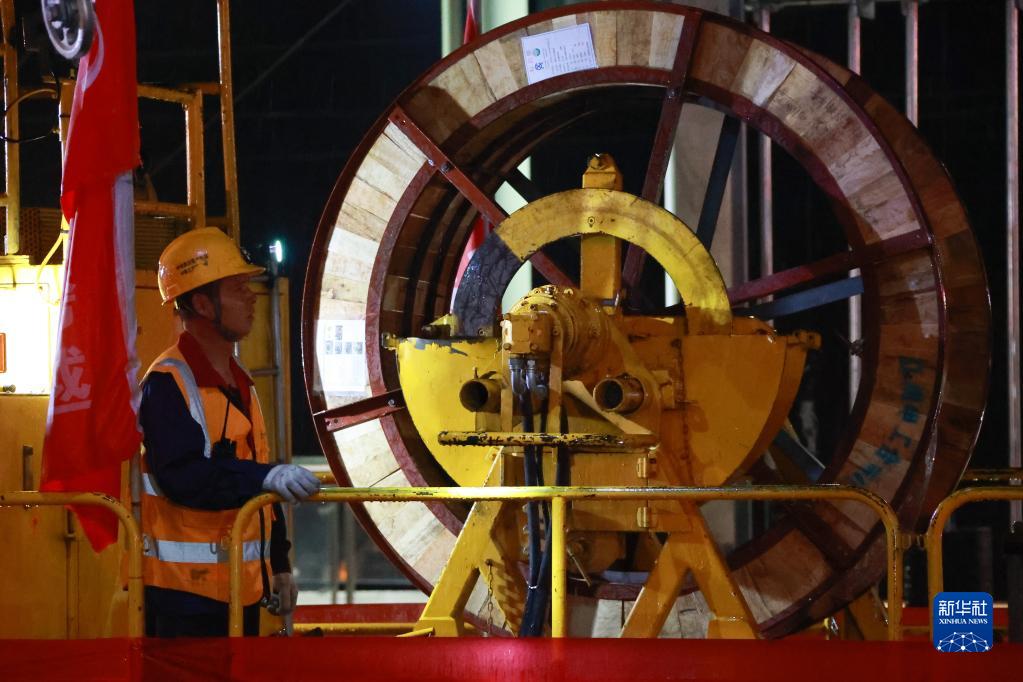 4月1日,工作人員在架線車上釋放接觸網導線。