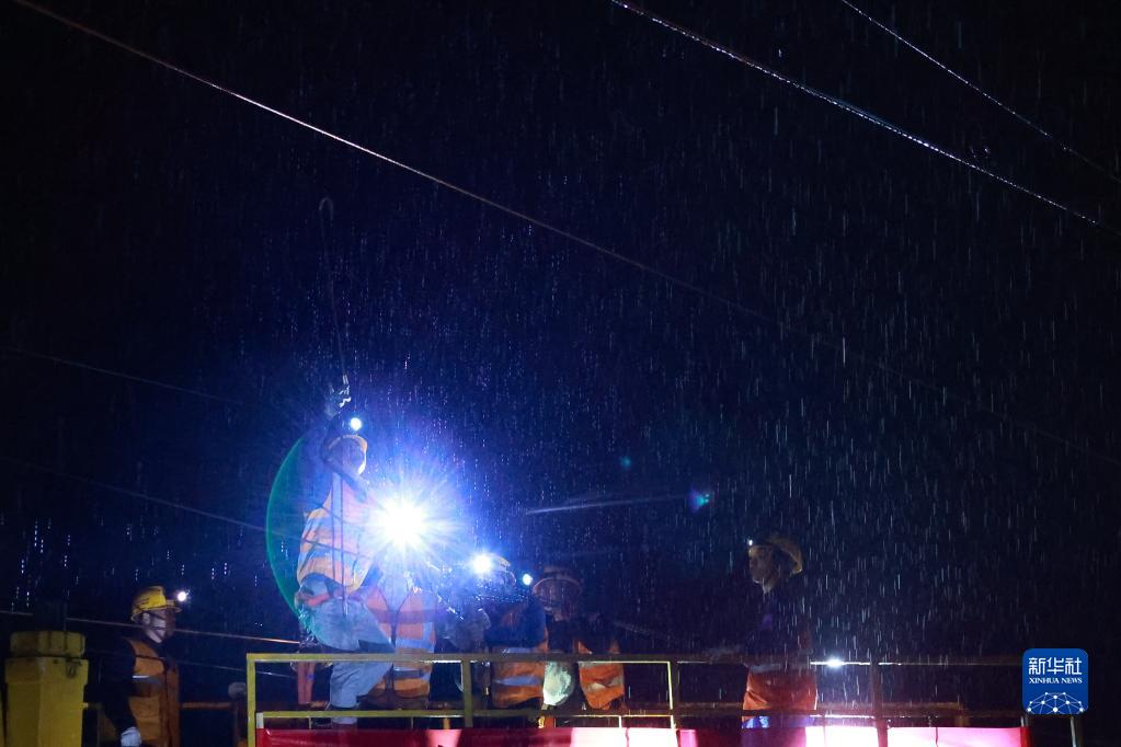 4月1日,工作人員乘坐架線車對接觸網(wǎng)導(dǎo)線進(jìn)行架設(shè)。