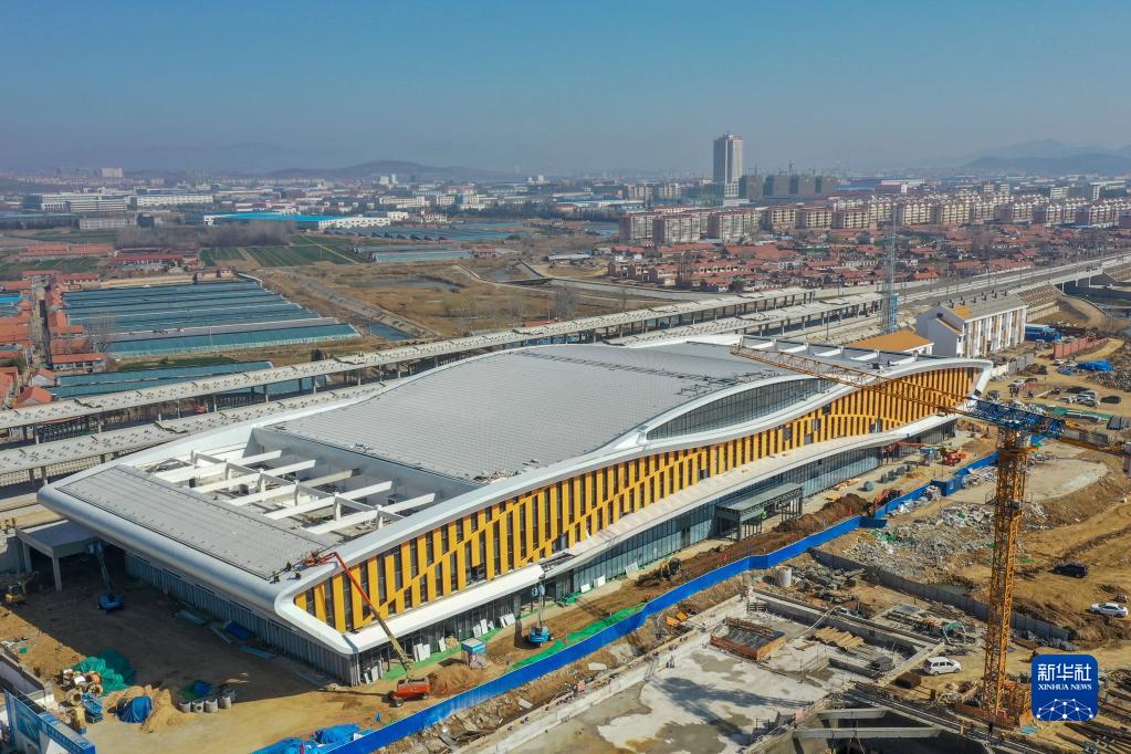 鳥瞰建設(shè)中的萊榮鐵路海陽(yáng)站(3月31日攝 ,無(wú)人機(jī)照片)。