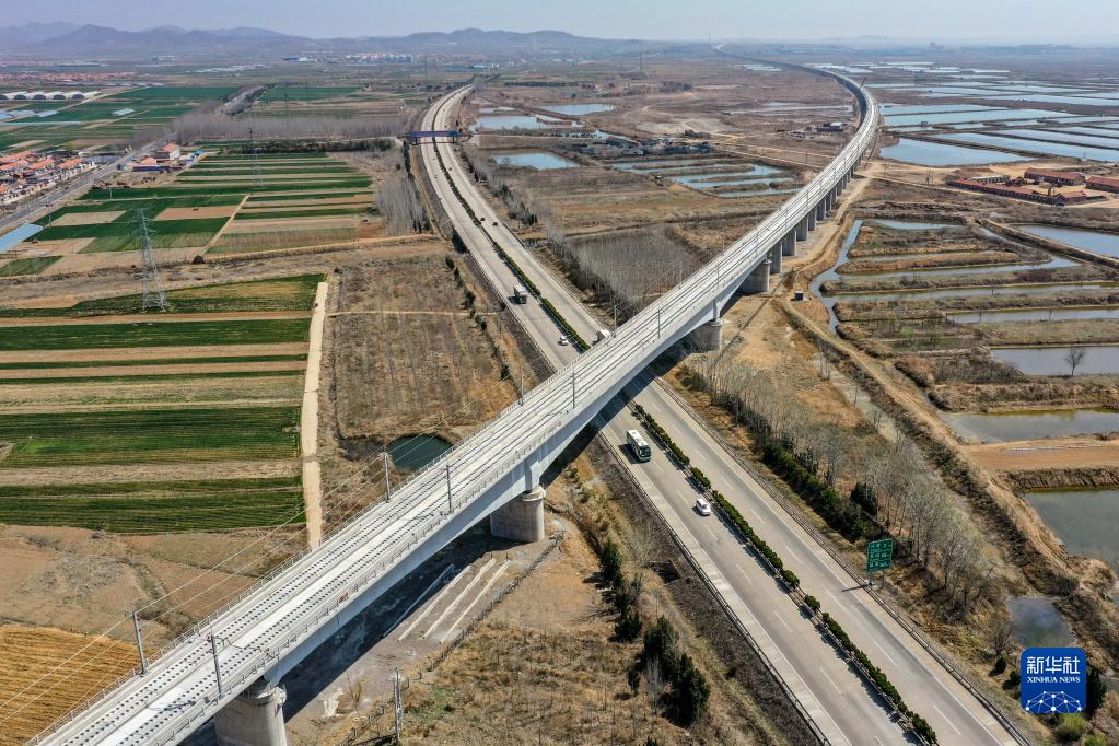 鳥瞰萊榮鐵路跨威青高速特大橋段(3月31日攝,無人機照片)。