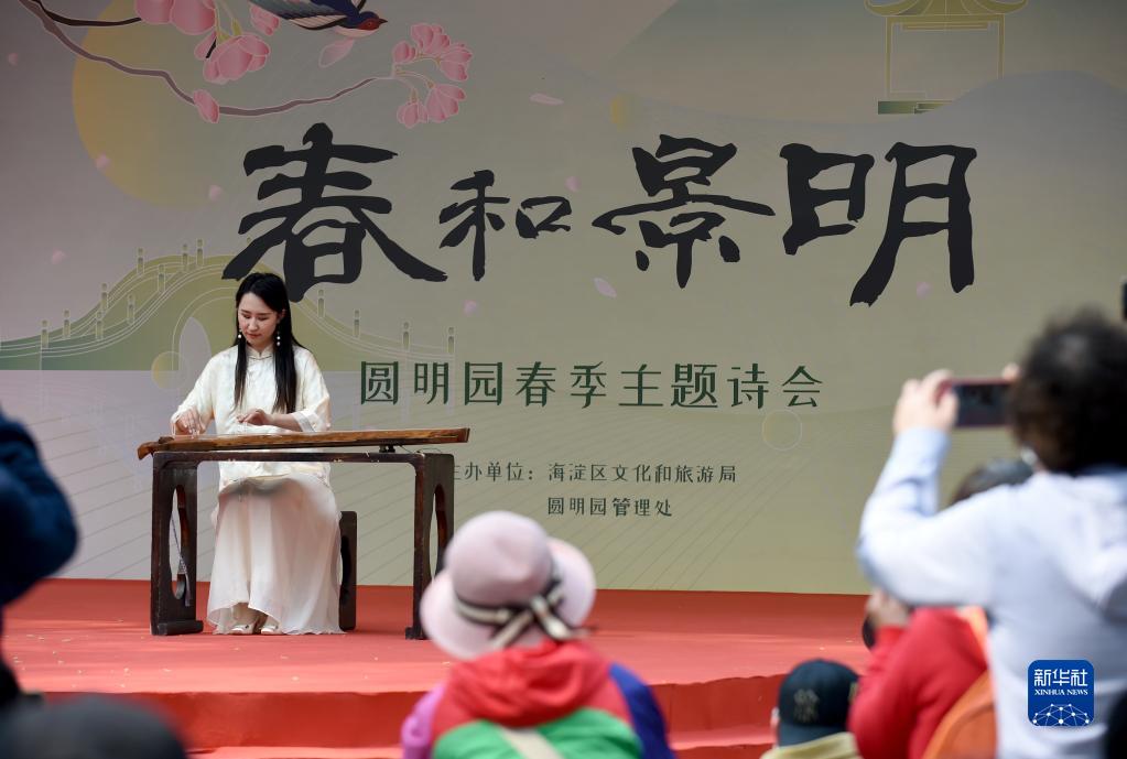 4月1日,一名青年古琴演奏家在圓明園春季主題詩會上彈奏古琴。