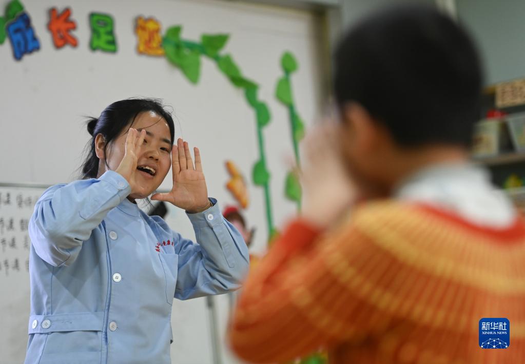 3月30日,在西安市金色陽光康復(fù)中心,特教老師(左)指導(dǎo)孩子進行康復(fù)訓(xùn)練。