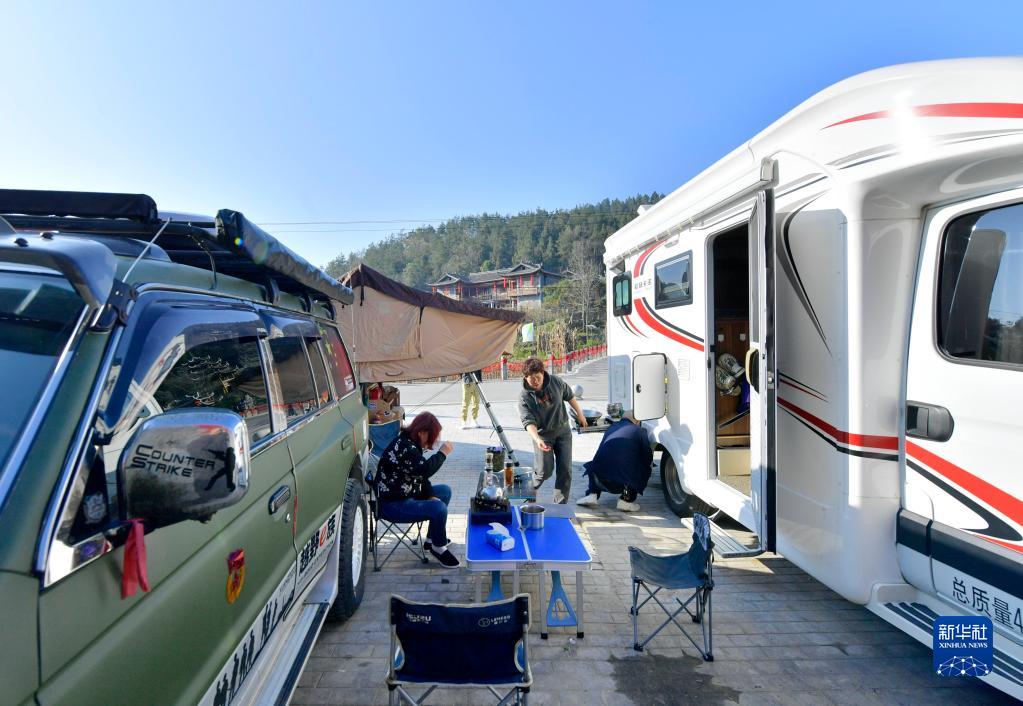 4月1日,在宣恩縣椒園鎮(zhèn)黃坪村,開著房車旅行的游客在梨園旁的空地上準(zhǔn)備早餐。
