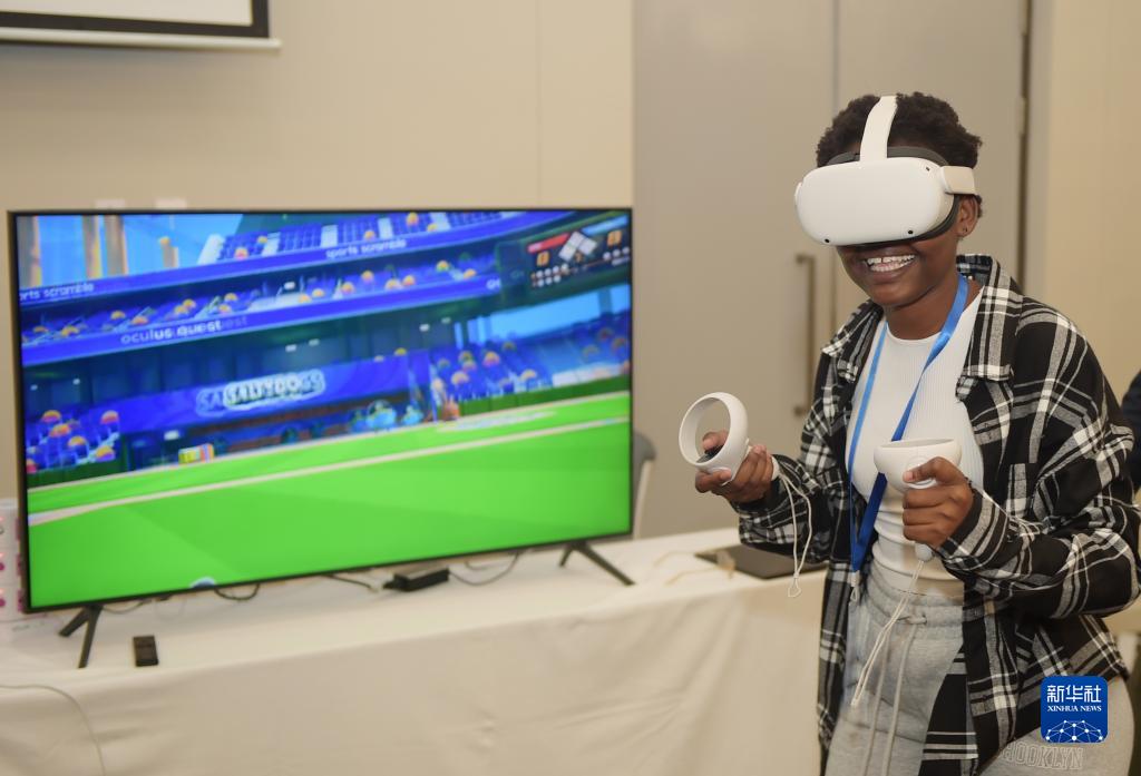 3月31日,在博茨瓦納首都哈博羅內,參觀者在通信展上體驗VR設備。