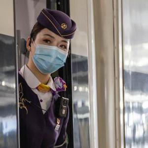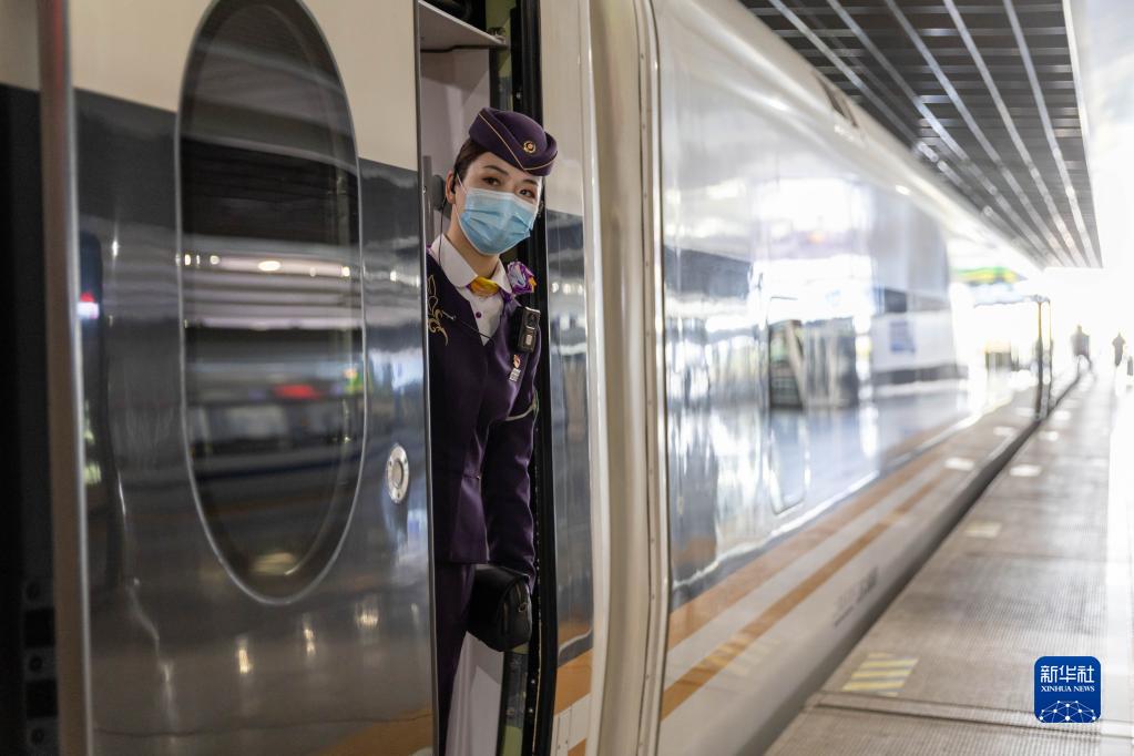 4月1日,G99次列車長李笑家在車門口瞭望。