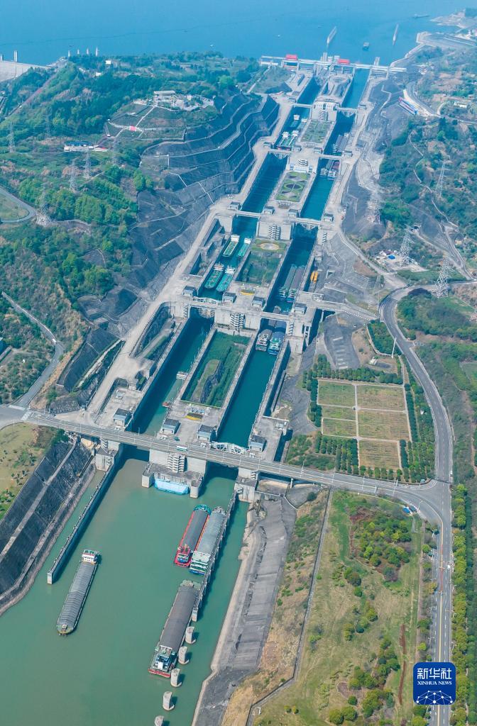 4月1日,船舶有序通過三峽雙線五級船閘(無人機照片)。