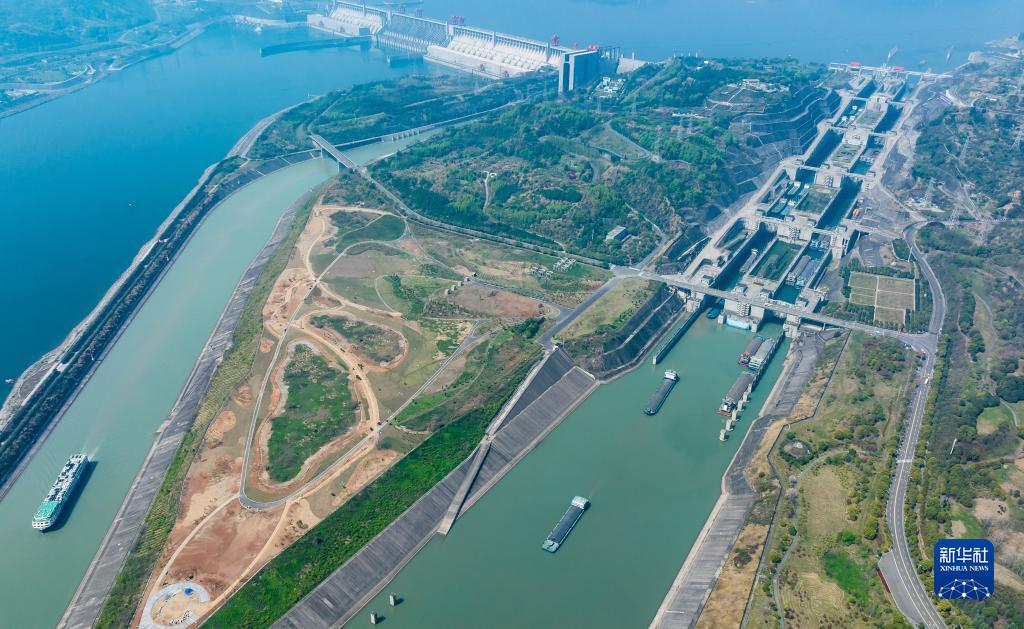 4月1日,船舶有序通過三峽雙線五級船閘和升船機(jī)(無人機(jī)照片)。