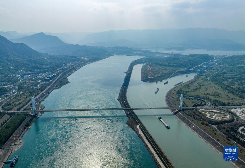 4月1日,船舶有序通過三峽雙線五級船閘(無人機照片)。