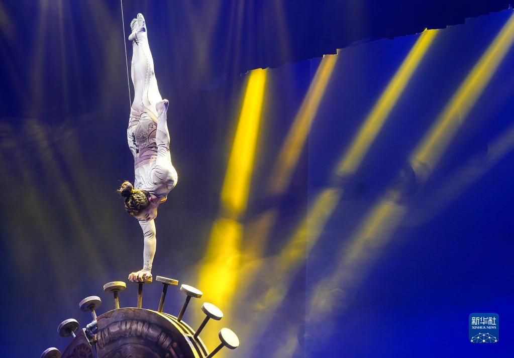 3月31日,在江蘇省鹽城市建湖縣,雜技演員王夢塵在表演雜技節目《煉——倒立技巧》。