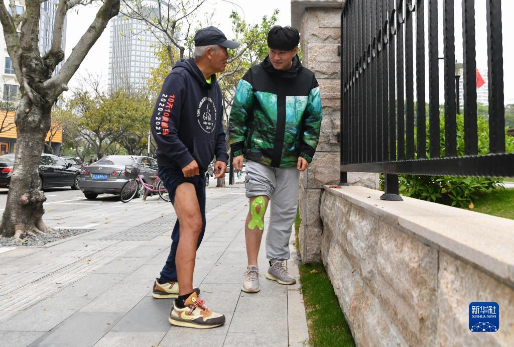 為準備明日開賽的廈門馬拉松,高振海(左)在與跑友交流跑馬拉松的技巧(4月1日攝)。
