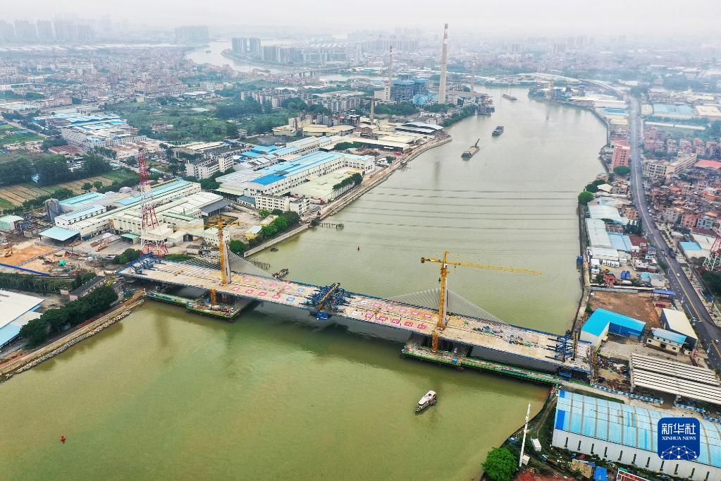 東莞槎馬特大橋主跨合龍段施工現(xiàn)場(4月2日攝,無人機(jī)照片)。