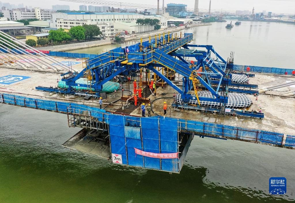 東莞槎馬特大橋主跨合龍段施工現(xiàn)場(4月2日攝,無人機照片)。