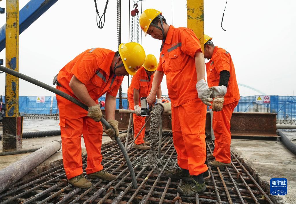4月2日,施工人員在東莞槎馬特大橋主跨合龍段澆筑混凝土。