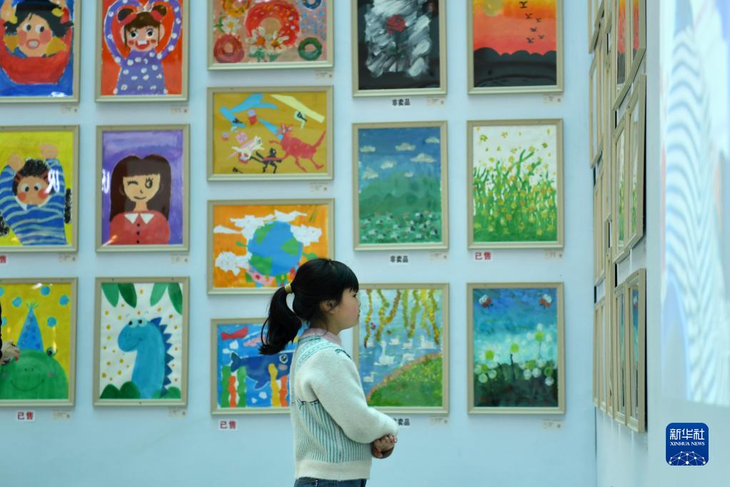 4月2日,小朋友在世界孤獨(dú)癥日主題慈善活動(dòng)現(xiàn)場觀看藝術(shù)畫作。