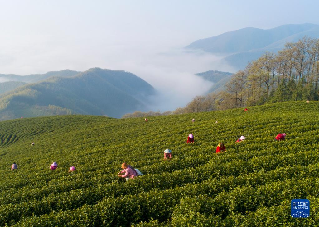 4月2日,采茶工在浙江省湖州市安吉縣杭垓鎮的生態茶園里采摘明前茶(無人機照片)。