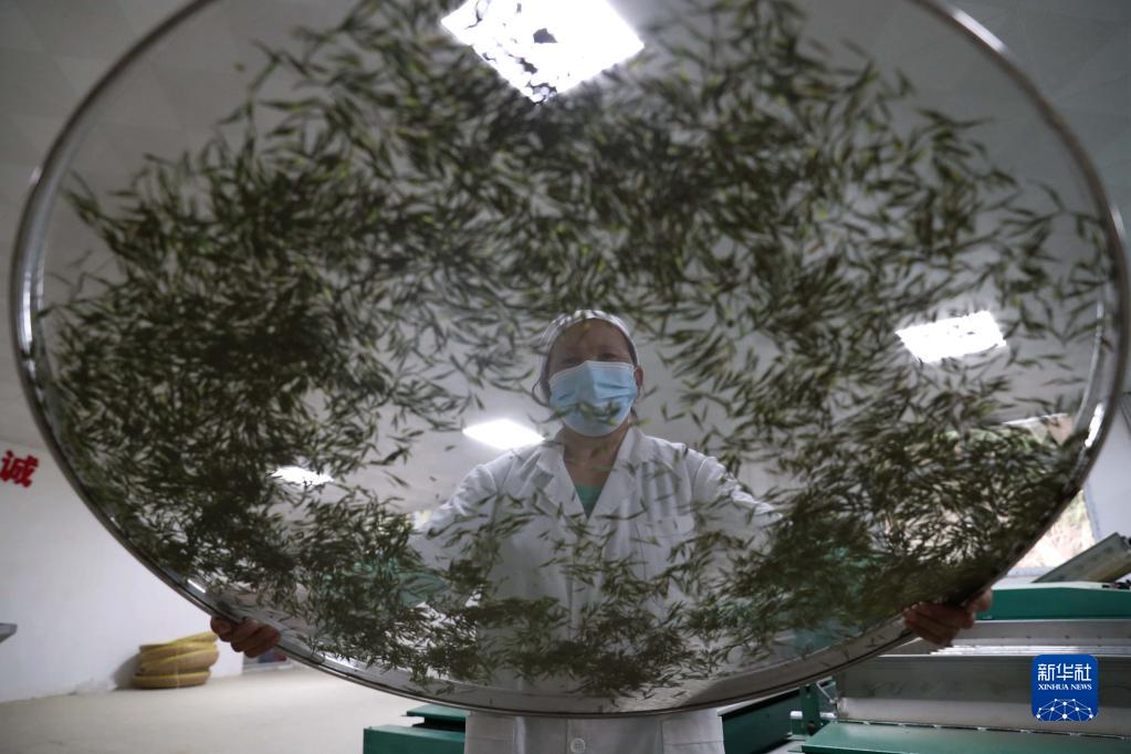 4月1日,在貴州省黔東南苗族侗族自治州榕江縣兩汪鄉空申村青白茶烘烤房內,工人從烘烤機取出烘干的茶青。