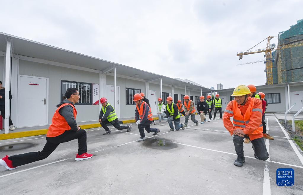 4月25日,社區(qū)工作人員帶領(lǐng)工地勞動者學(xué)習(xí)簡單的放松操。
