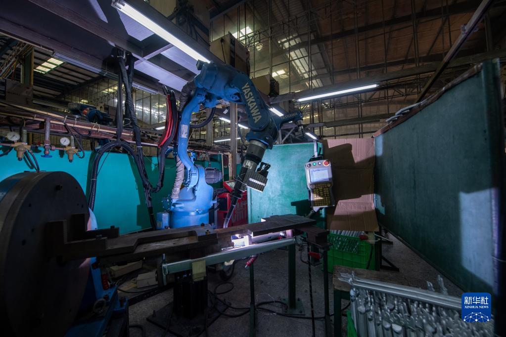 4月13日,在深圳市喜德盛自行車股份有限公司生產(chǎn)線,機(jī)械臂焊接車架。
