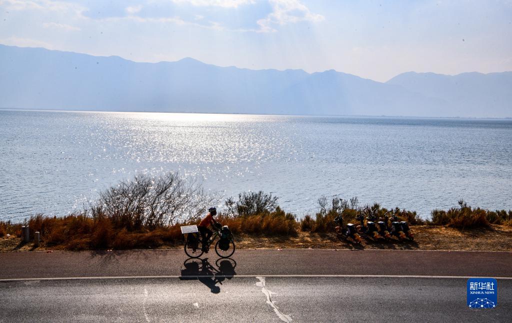 4月19日,來自廣東的騎行愛好者潘有輝騎行在云南大理洱海邊。數月前他從廣東佛山出發,一路騎行抵達大理。