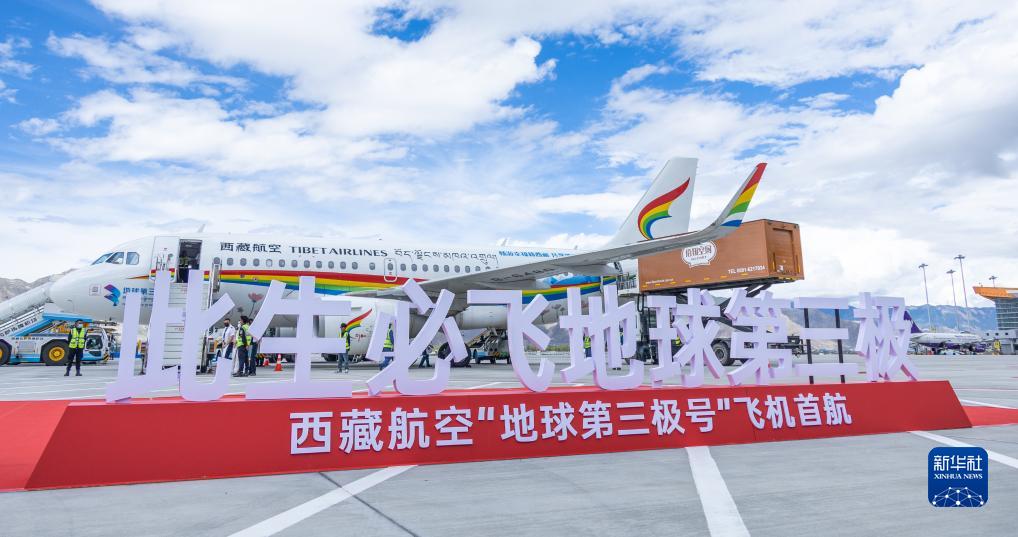 8月25日,以“地球第三極號”冠名的西藏航空TV9851次航班從成都飛抵拉薩貢嘎國際機場。此活動旨在推動西藏特色產業發展,同時吸引更多人走進西藏、發展西藏、宣傳西藏。新華社發(丁增尼達攝)