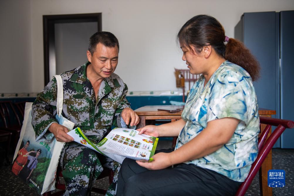 8月24日,在瀏陽市金剛鎮平灣村,黃蔚谷(左)向村民宣傳森林防火和古樹保護相關知識。