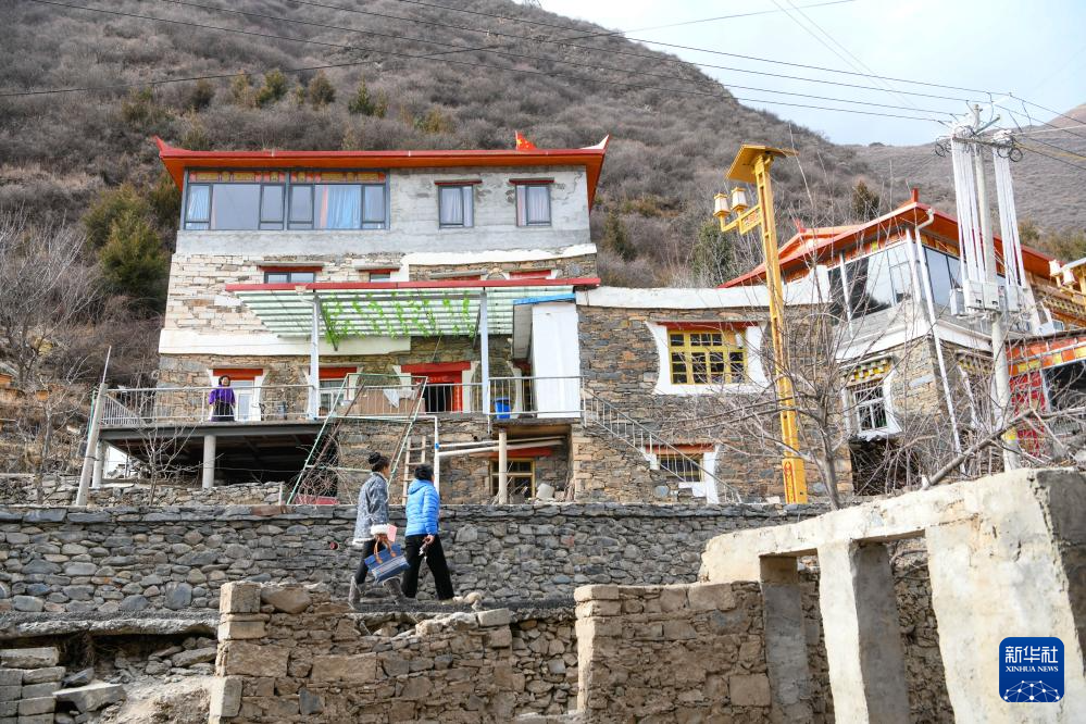 在马尔康市松岗镇松岗村,格西王姆和松岗村党支部书记赵春秀一起前往97岁老人周幺妹家了解情况(2月18日摄)。