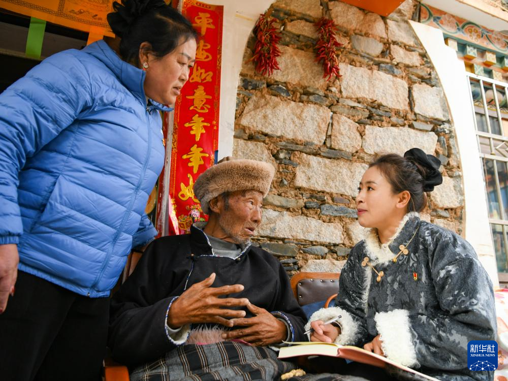 在马尔康市松岗镇松岗村,格西王姆在97岁老人周幺妹的家中了解高龄补贴领取情况(2月18日摄)。