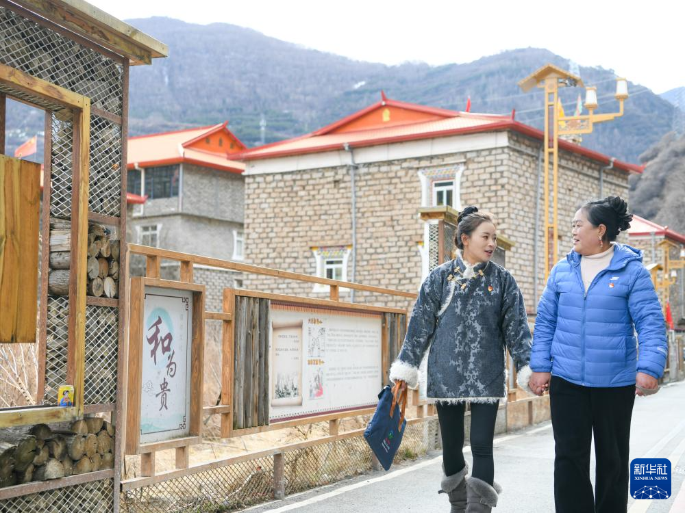 在马尔康市松岗镇松岗村,格西王姆和松岗村党支部书记赵春秀交流(2月18日摄)。