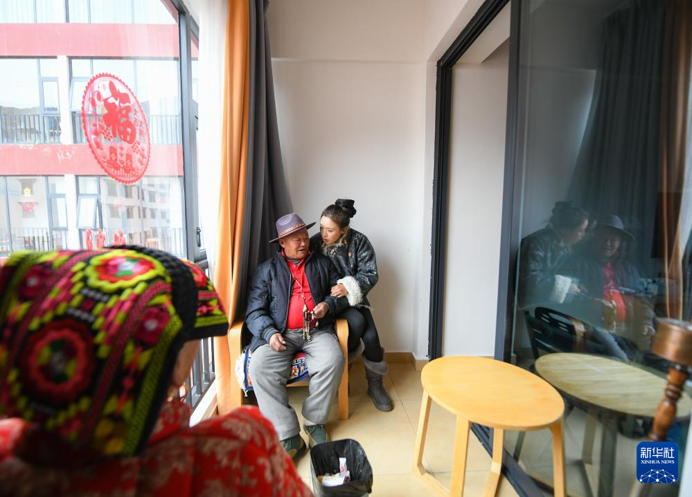 在马尔康市老年养护院,格西王姆和82岁老人更章交流(2月18日摄)。