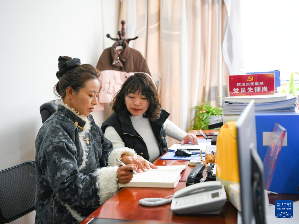 在阿坝州民政局,格西王姆向工作人员了解全州高龄老人群体基本情况数据(2月19日摄)。