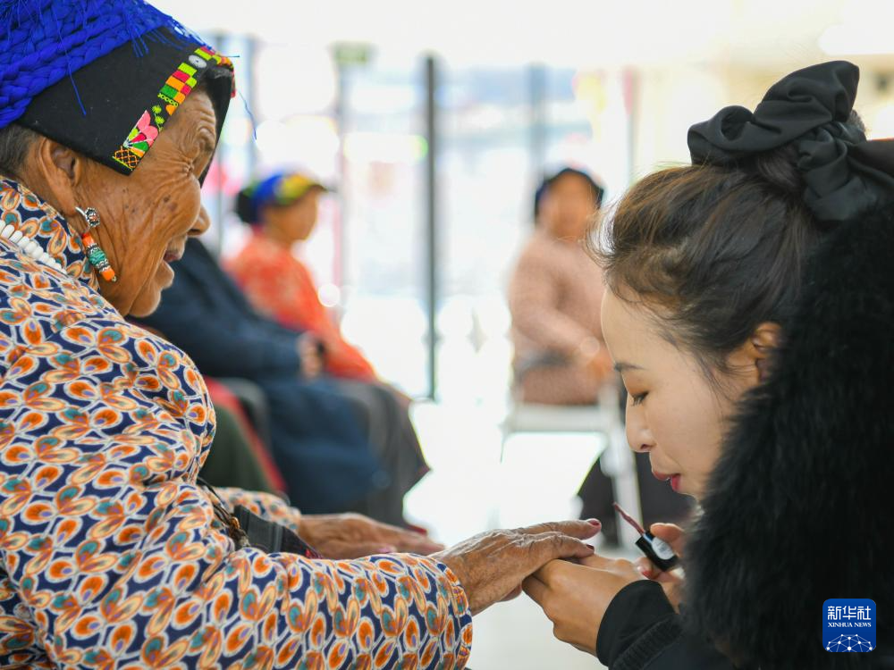 在马尔康市老年养护院,格西王姆为85岁的老人泽郎斯基擦指甲油(2月19日摄)。