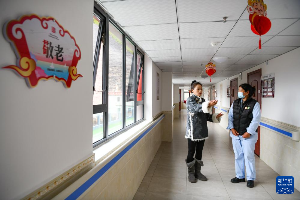 在马尔康市老年养护院,格西王姆和护理人员巴尔姆交流工作安排(2月18日摄)。