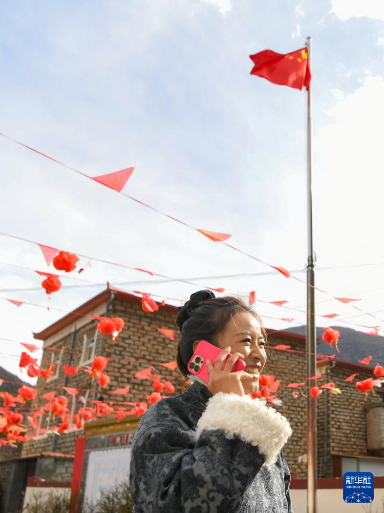 在马尔康市松岗镇松岗村,格西王姆通过电话向村里老人在外务工的子女了解情况(2月18日摄)。